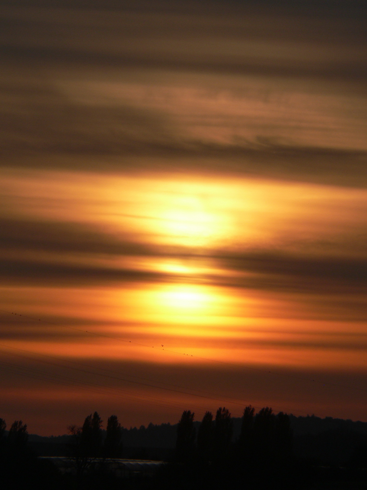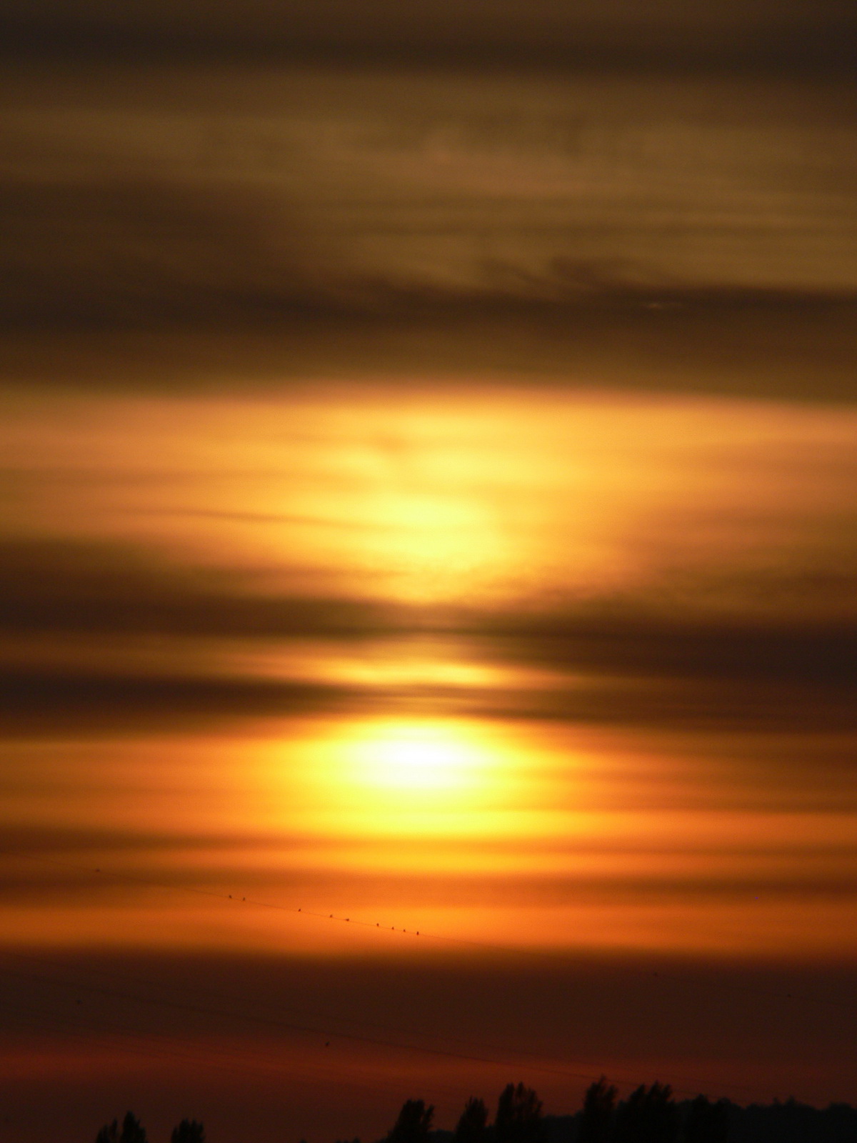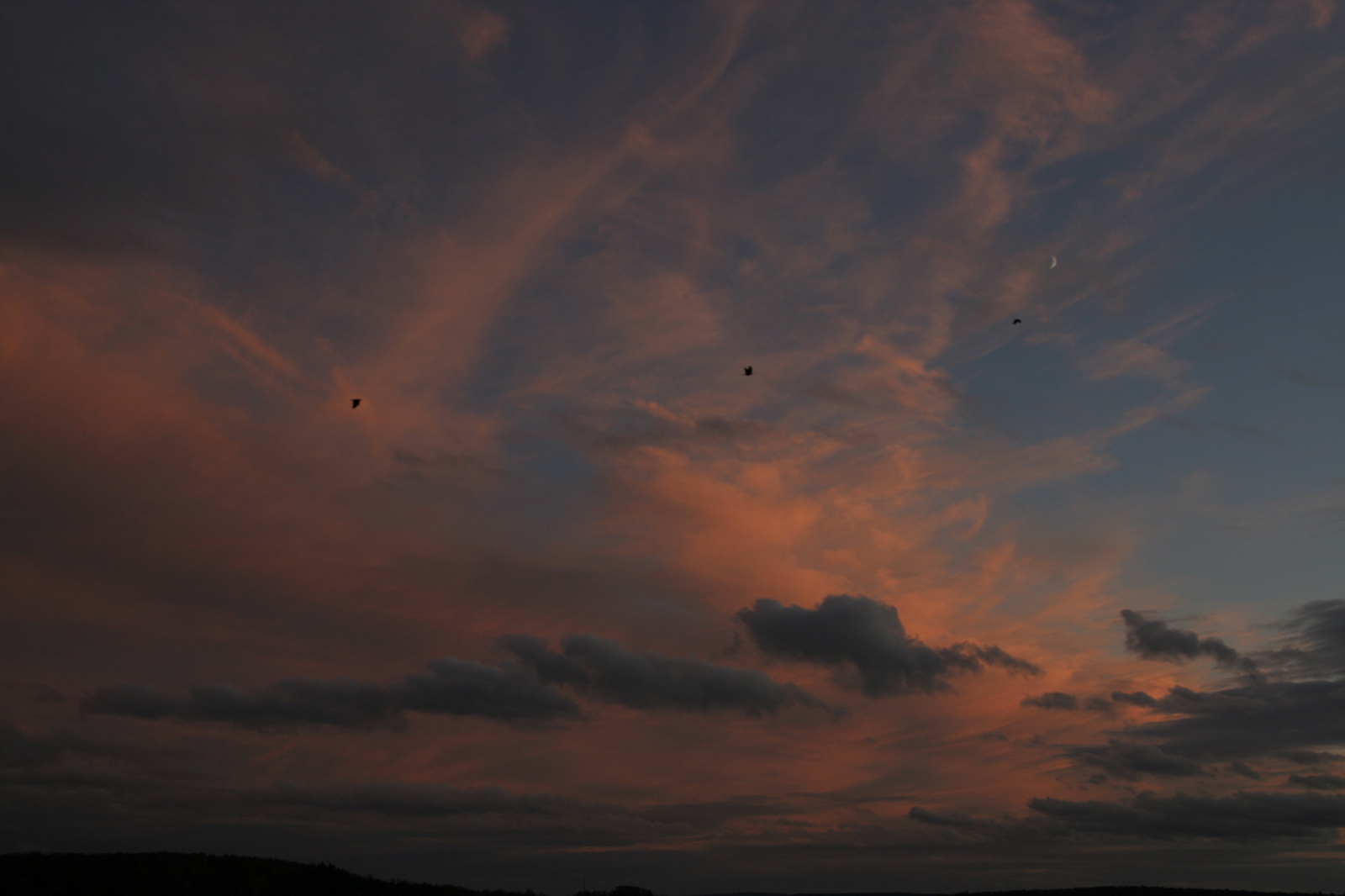 | Der Sonnenuntergang war für die Krähen das Zeichen sich auf den Weg nach Hause zu machen. |