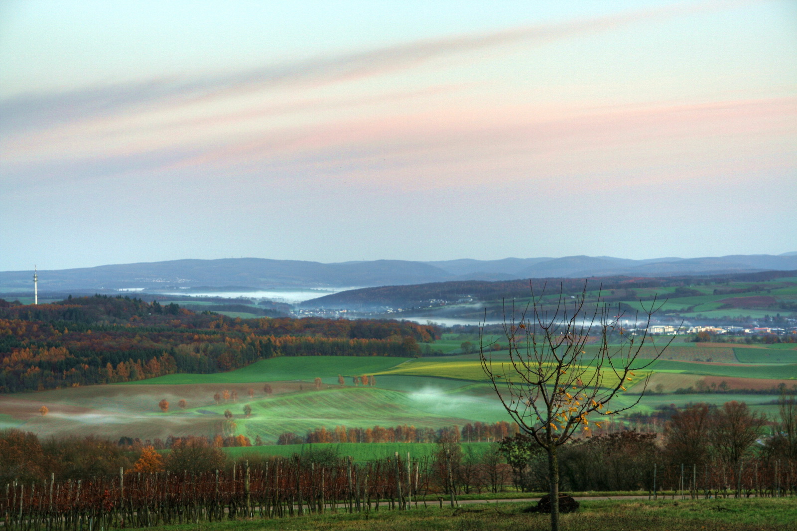 und zeigt den von den Feldern aufsteigenden Nebel. |