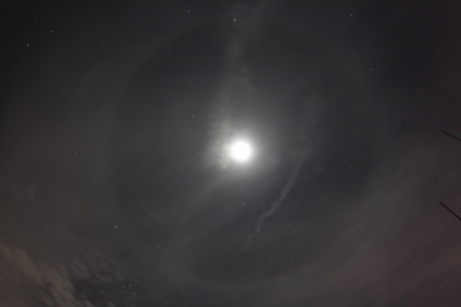 Wieder konnte ich mit meinem Zenitar ein Mondhalo aufnehmen. Mit auf diesem Bild sind die Plejaden, die Hyaden und der Fuhrmann.