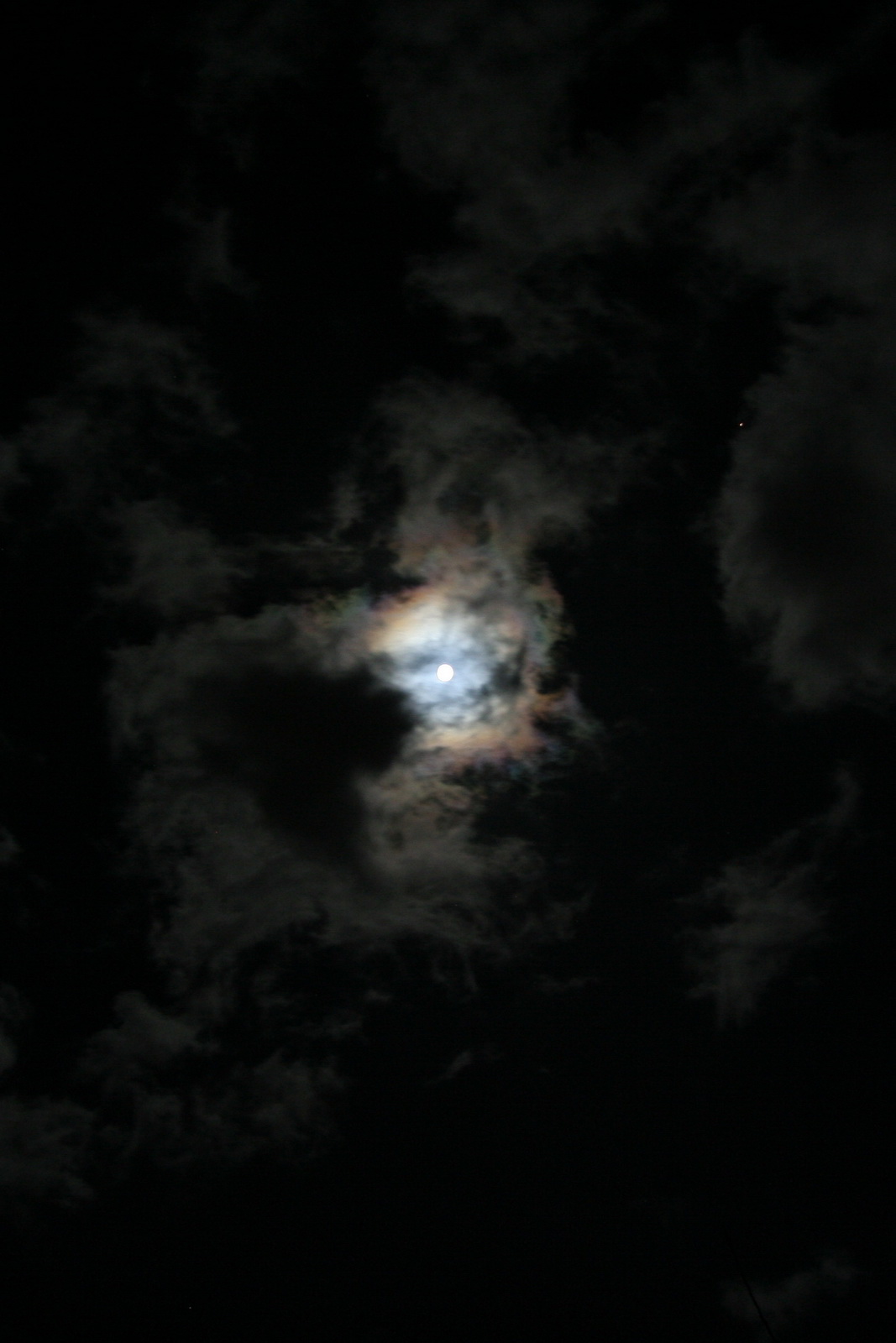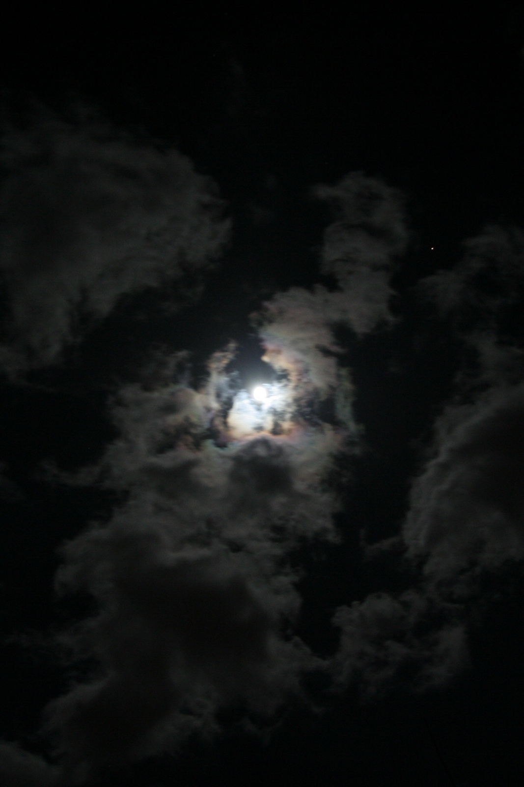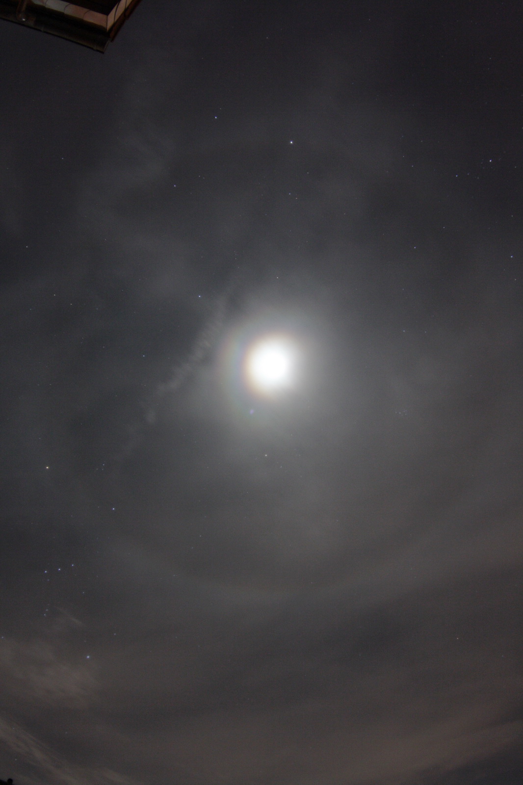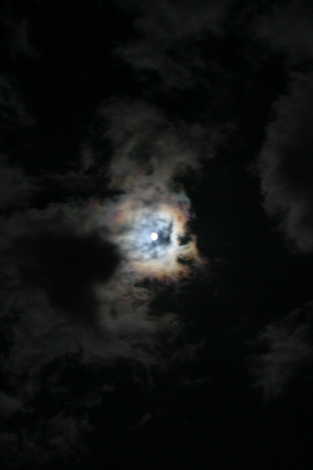 Die sehr schnell ziehenden Wolken verzierten den Mond immer wieder mit einem Kranz aus Farben.